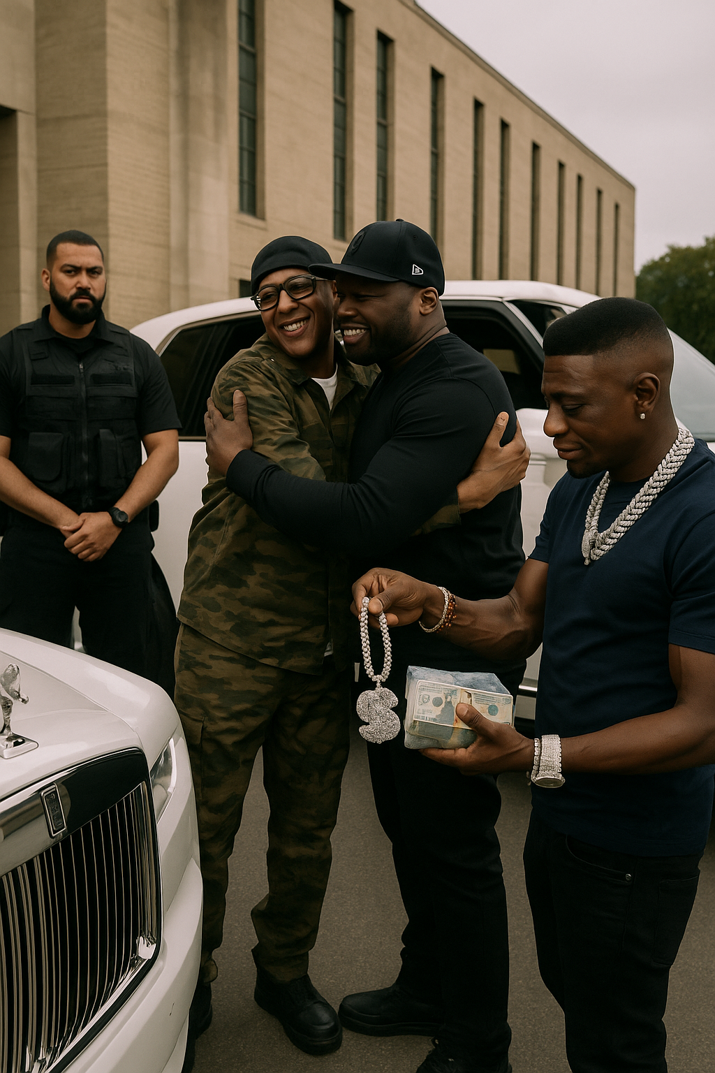 Sources close to the scene say 50 arrived in full boss mode — Rolls Royce Phantom purring at the gate, black-tinted SUVs trailing behind, and a tight security detail ensuring everything ran smooth. Moments after C-Murder walked free, none other than Boosie Badazz appeared, dapping both of them up and handing over a duffel bag of cash and a diamond-studded buss-down chain as a “welcome home” gift.
