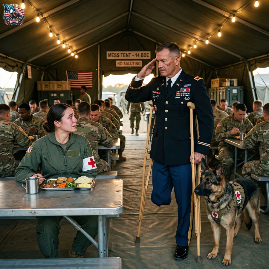 His aides stiffened instantly. Ranger gave one short, low sound—not a bark, not a growl, more like a warning forced through clenched teeth. I looked past the general toward the serving line. One of the kitchen contractors was moving too fast. Another had stopped moving completely.
