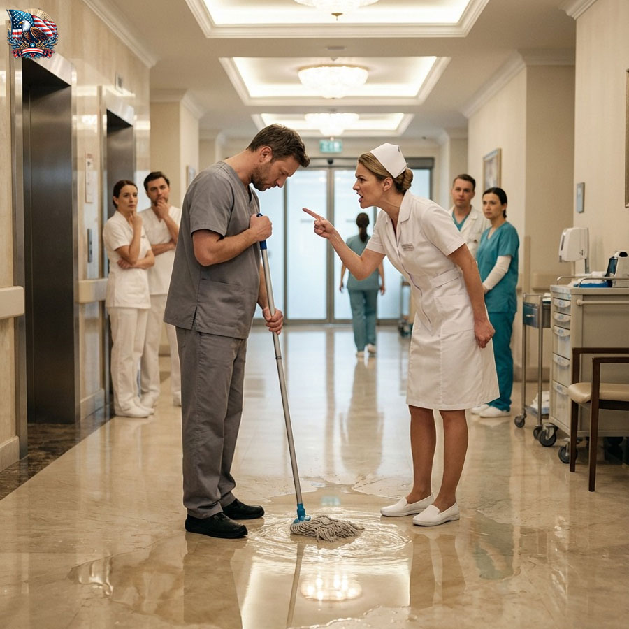 Some nurses mocked the cleaners openly. Nurse Fallon Drake—flawless uniform, sharp tongue—treated the custodial staff like they were invisible furniture. In the halls she snapped, “Watch where you’re going,” and in the cafeteria she laughed about “people with no ambition” as if dignity had a pay grade. An older cleaner, Omar, quietly warned Caleb, “Don’t take it personal. Some folks wear arrogance like a badge.”