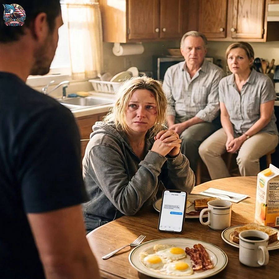 I hear him first—the heavy steps, the throat clearing. He appears in the doorway, still carrying that lazy, confident expression of someone who assumes last night has already been minimized into “a bad moment.”