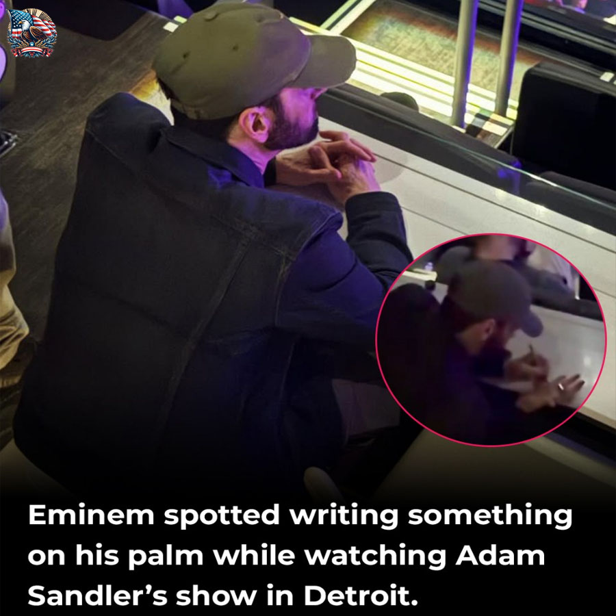 An unseen video of Eminem quietly writing lyrics on his palm while attending Adam Sandler’s show in Detroit has recently surfaced online, instantly capturing the attention of fans and reigniting fascination with the rapper’s creative process. The brief clip, grainy and candid, offers a rare glimpse into a side of Eminem that audiences seldom witness outside of studio documentaries or carefully framed interviews: the relentless writer who never stops working, even when he is supposed to be offstage.