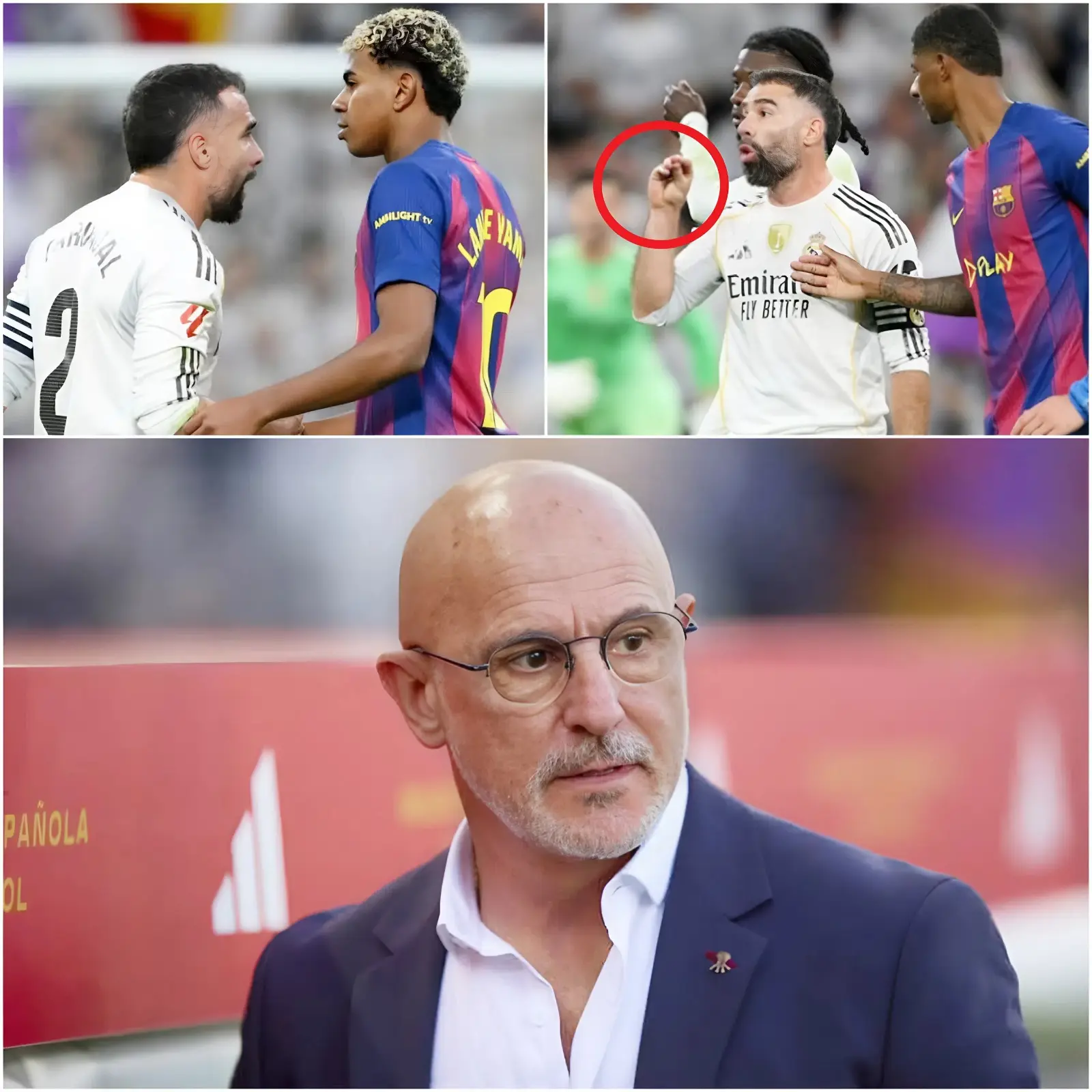 Although the match offered the usual mix of football quality and controversy typical of El Clásico, the tensions did not end with the final whistle. In the midst of the culé disappointment, a heated exchange took place between Barcelona’s young promise, Lamine Yamal, who had previously attracted attention with defiant statements directed at the Madrid fans, and veteran Dani Carvajal. What began as a verbal confrontation quickly became a symbol of the deep rivalry that defines these two giants of Spanish football.