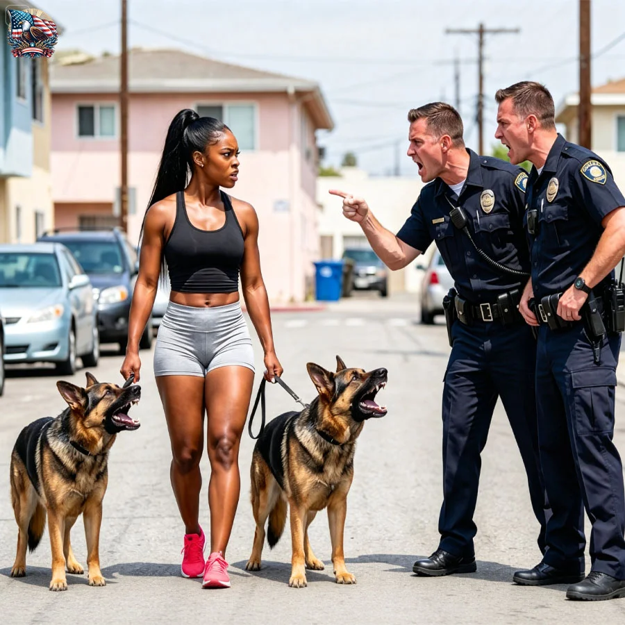 He moved suddenly, reaching not for Naomi, but for his radio and belt line with a jerking aggression Titan interpreted instantly as escalation. Both dogs surged forward half a step—not attacking, not lunging blindly, but positioning themselves between Naomi and the officers in a sharp, controlled defensive wall, ears high, bodies rigid, warning clear.