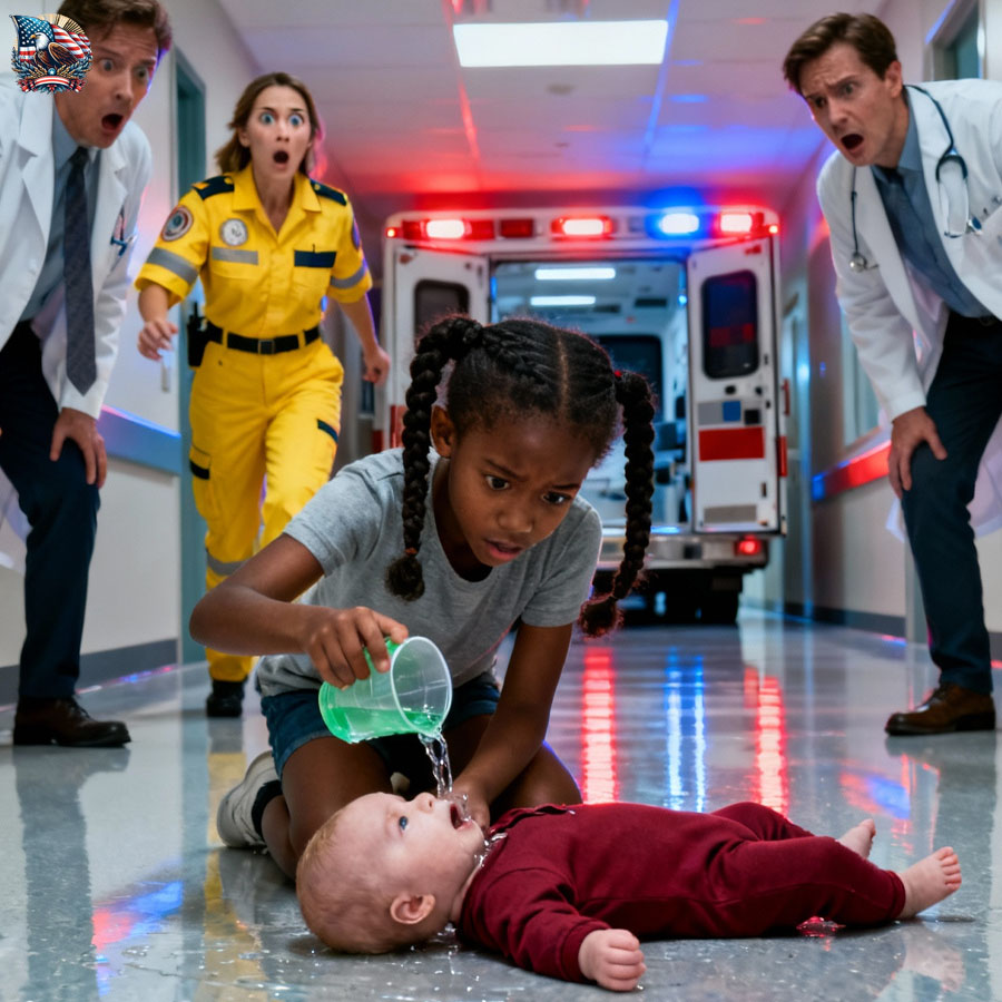 The doctors stared at the girl kneeling beside the baby, water dripping from the green cup onto the marble.