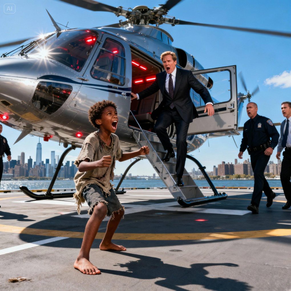 The voice was sharp, desperate, and unexpected. Alexander Whitmore, a sixty-year-old billionaire real estate mogul, froze on the steps of his private helipad in Manhattan. He turned around sharply, visibly annoyed at being shouted at in public. The sound had come from behind the security fence, where a skinny Black boy in torn jeans and an oversized hoodie stood, gripping the railing with white knuckles.