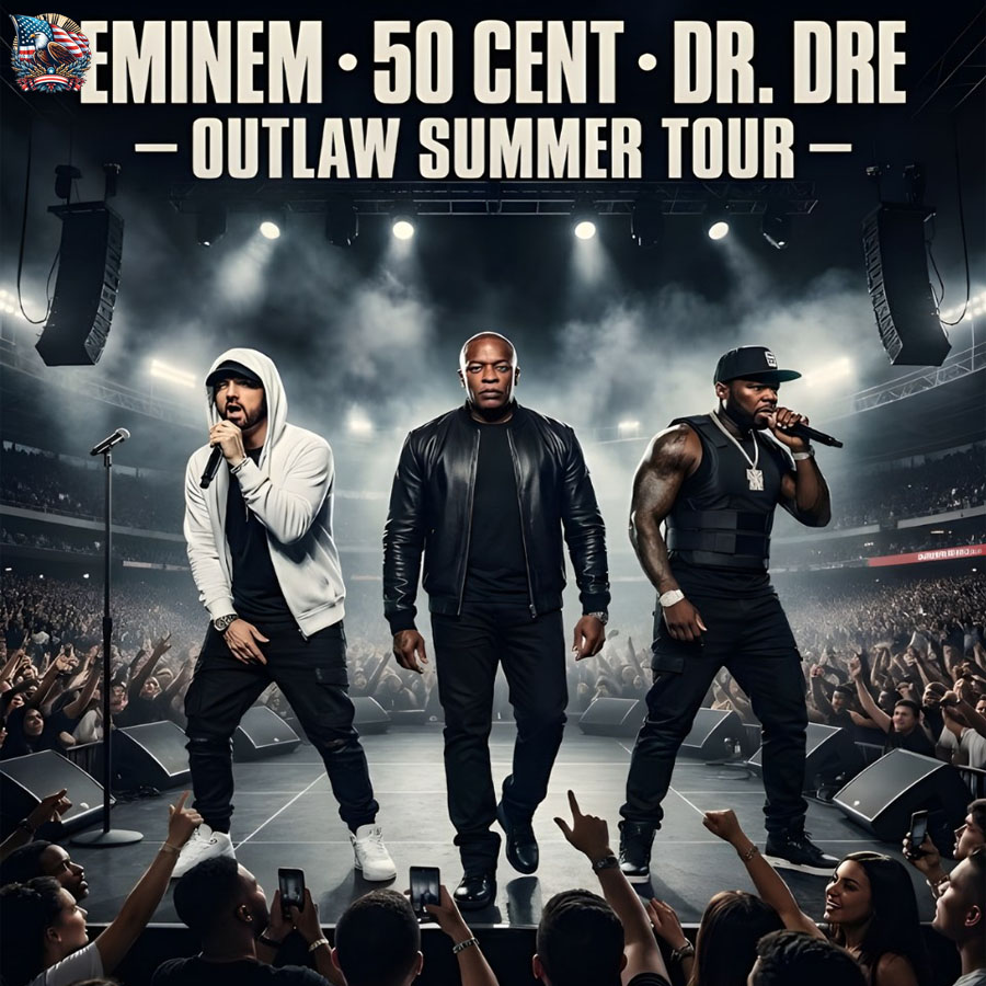 Three of music’s most monumental and defining voices are coming together for what’s being billed as a final shared tour. Known for their raw honesty, genre-shaping influence, and emotionally charged performances, Eminem, 50 Cent, and Dr. Dre will take their Final Bow in 2026.