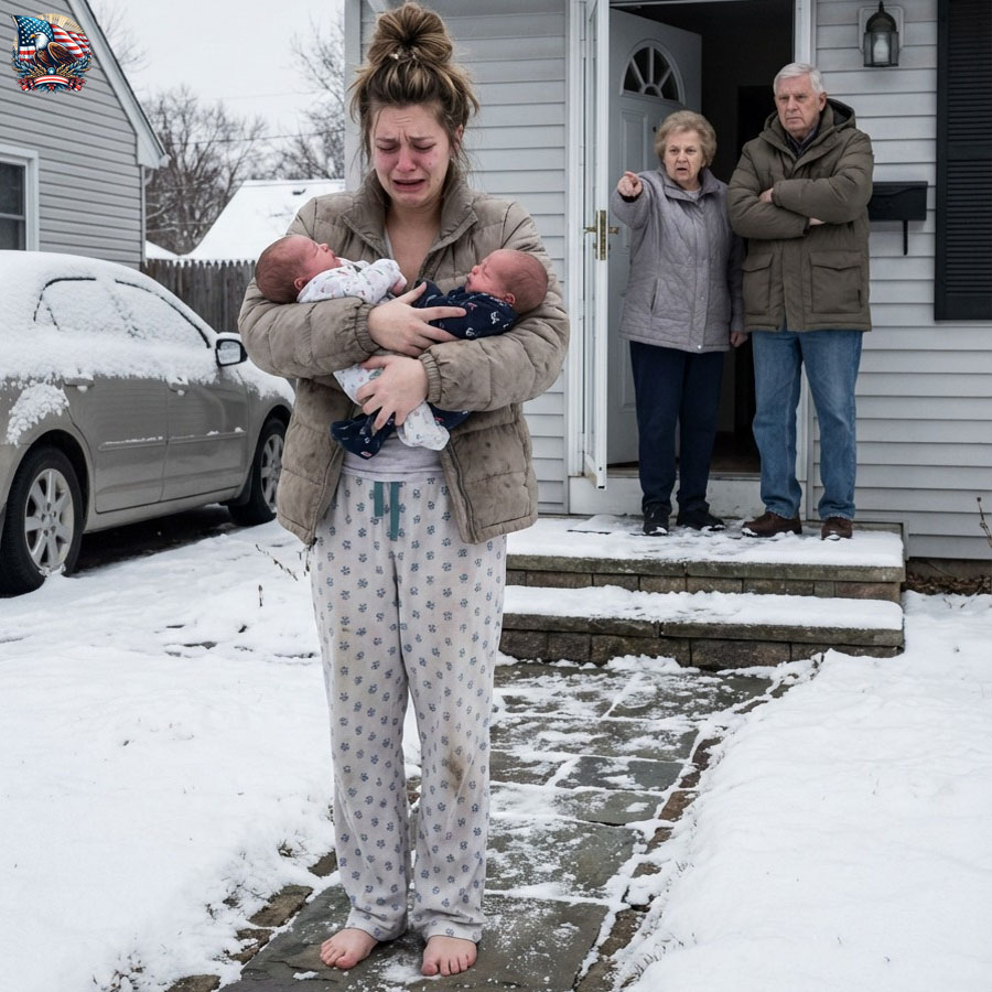 Her words hit harder than the freezing wind. Natalie stood in the doorway, holding her ten day old twin daughters against her chest. Their tiny faces were red from crying, their blankets thin and already damp from melting snowflakes that drifted inside as the door swung open.