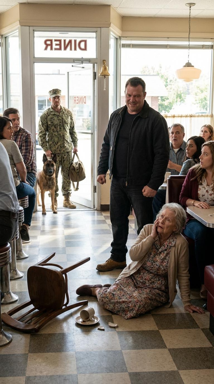 Ethan Hale stepped inside, dust clinging to his boots, a worn duffel slung over one shoulder, his movements carrying the quiet fatigue of long roads and longer nights, and at his side moved Atlas, a Belgian Malinois whose stillness radiated discipline rather than calm, the kind of dog that didn’t simply stand but waited, coiled and aware, reading the room before anyone else had time to explain it.