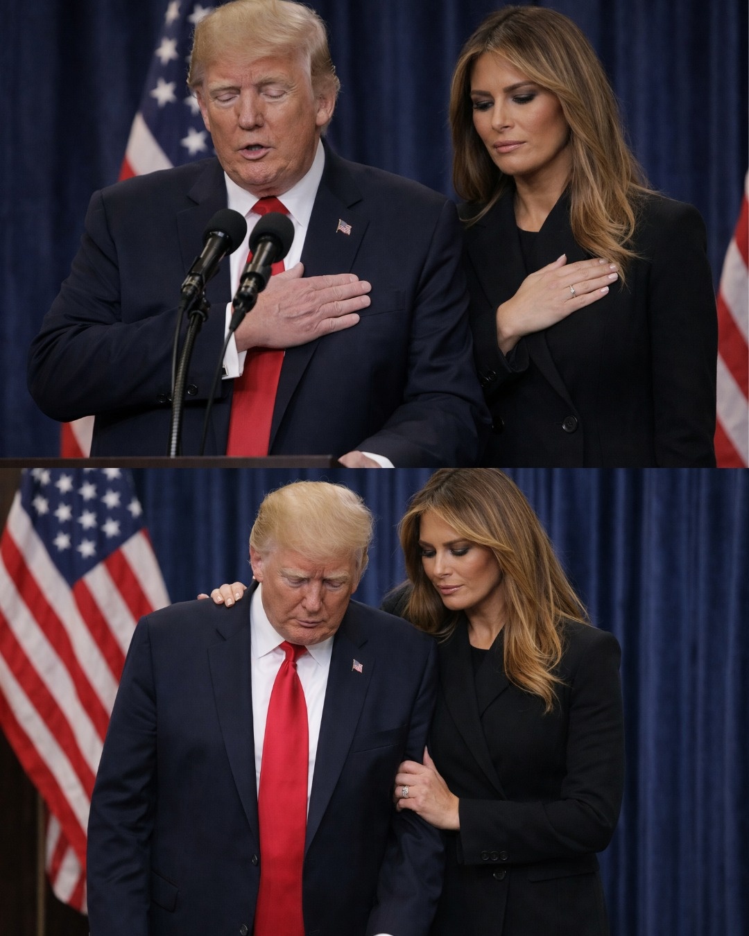 The room grew noticeably quiet as former President Donald Trump stepped up to the podium. The atmosphere was tense but attentive, with dozens of cameras pointed toward the stage. Beside him stood Melania Trump, composed and silent, observing the audience as reporters and guests waited for his remarks.