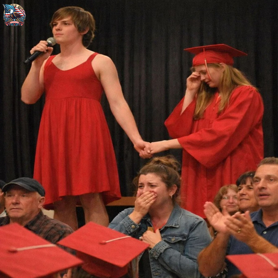 He walked through the doors wearing not the standard cap and gown, but a flowing red dress that caught the light with every step. It wasn’t sloppy or mocking. It was elegant, carefully chosen, the kind of dress that demanded to be seen. The room reacted instantly. Laughter rippled through the seats. Whispers spread like wildfire.