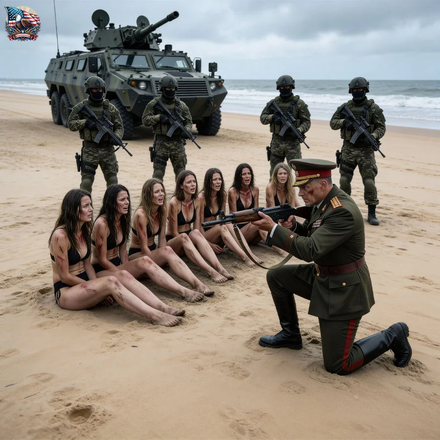 He was in the dock below, lit by work lamps and red warning beacons, dressed in enemy marine blacks with a sidearm and an old American watch still on his wrist like he couldn’t let his previous life stop touching his skin. Around him were the eight captives—aid workers, not fighters—hands bound, huddled against a rusted mooring wall beside stacks of fuel drums and supply cages. Two heavy gunners covered the only clean route down.