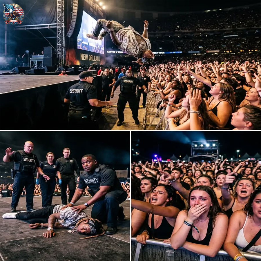 The incident occurred last night during a highly anticipated concert stop. Eyewitness accounts describe the moment as sheer panic. Lil Wayne, ever the consummate showman, attempted a complex backward flip—a move he has incorporated into his shows to amplify the crowd’s energy. However, this time, the landing went catastrophically wrong. He is said to have landed directly on his head and neck, immediately collapsing on stage as the music came to an abrupt halt.