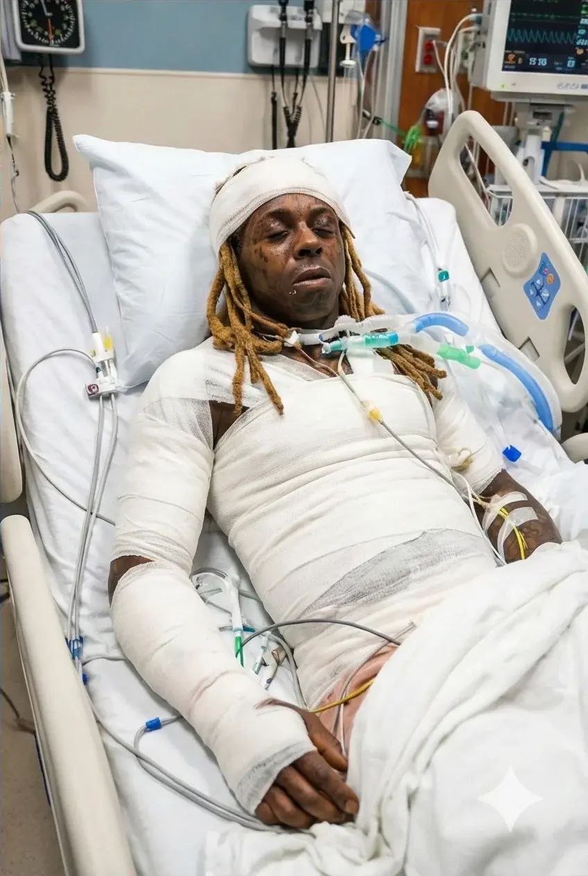 In a horrifying incident that has sent shockwaves through the music industry, rap icon Lil Wayne is fighting for his life after sustaining burns over 70% of his body. The tragedy occurred late last night following a sudden explosion inside his private recording studio, a space that has been the creative cradle for countless hits.