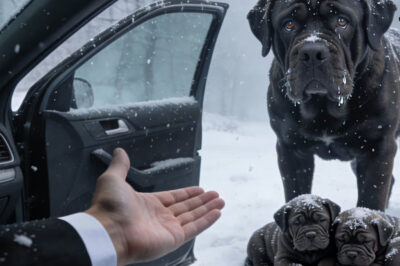 A mother Neapolitan mastiff stood trembling in the blizzard. Her massive body curled protectively around two tiny puppies barely clinging…