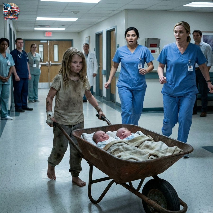 “My mommy hasn’t woken up in three days,” a seven-year-old girl said softly as she pushed a wheelbarrow for miles, trying to save her newborn twin brothers. What happened next shocked the entire hospital and left everyone speechless.