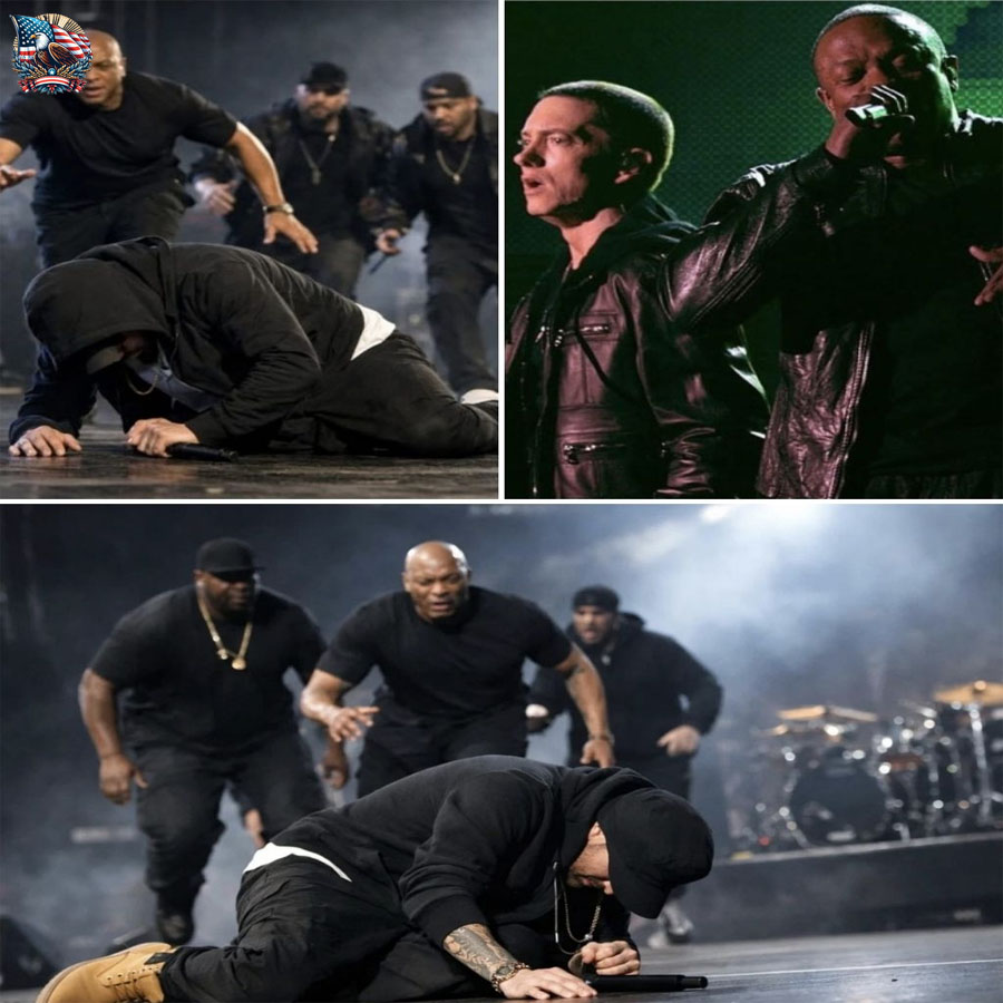 Dre rushed to Eminem’s side, kneeling beside him as crew members and medical staff flooded the stage. Fans watched in disbelief as the man whose voice defined a generation lay still beneath the lights. Some screamed his name. Others prayed. Many simply stood frozen, phones lowered, realizing they were witnessing something far more serious than a paused show.