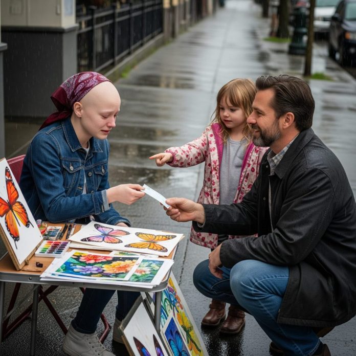 On a cold afternoon in Seattle, a teenage girl sat on the sidewalk selling her watercolor paintings. Her hands trembled—not from the chill, but from chemotherapy fatigue. Most people passed without looking. Until a man pushing a stroller stopped, stared at her art—and did something that would change both their lives forever.