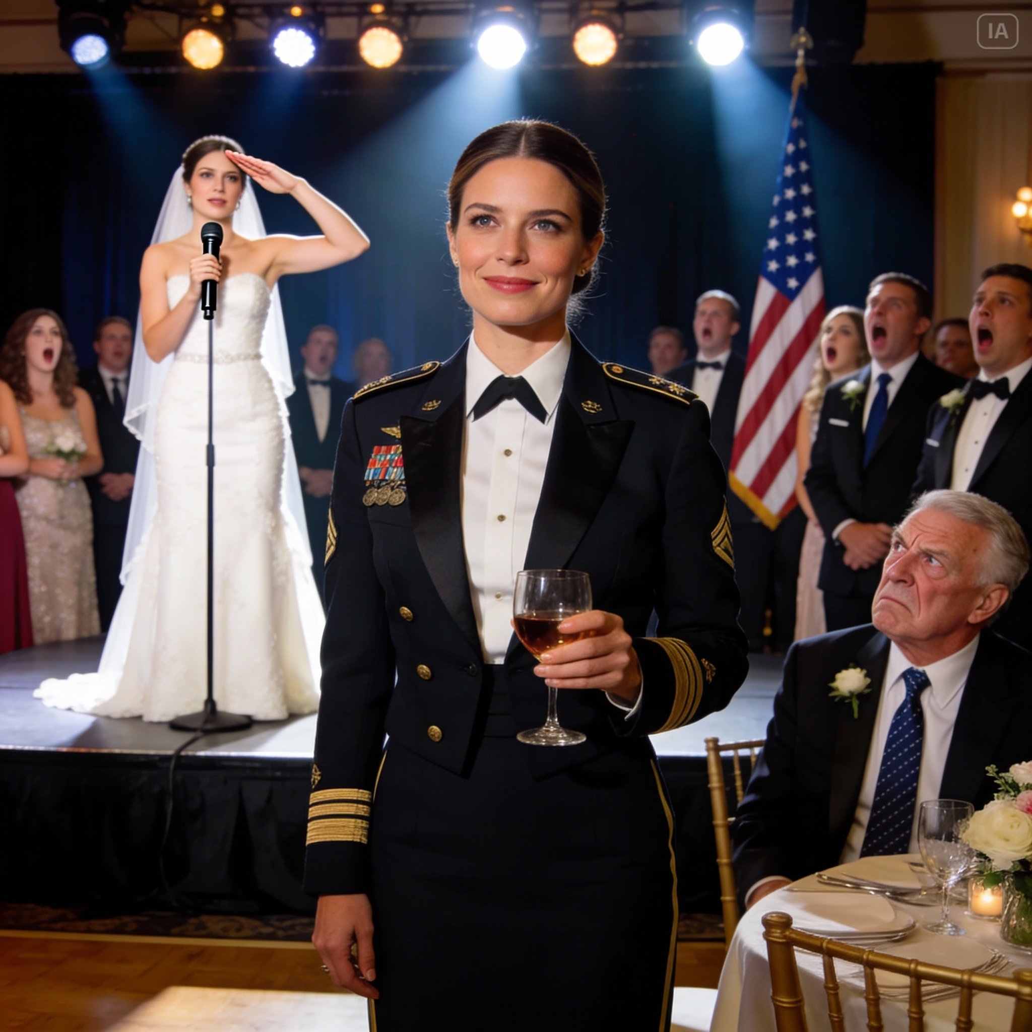 Then the bride picked up the microphone, turned to face me, gave a formal military salute, and announced loudly…
