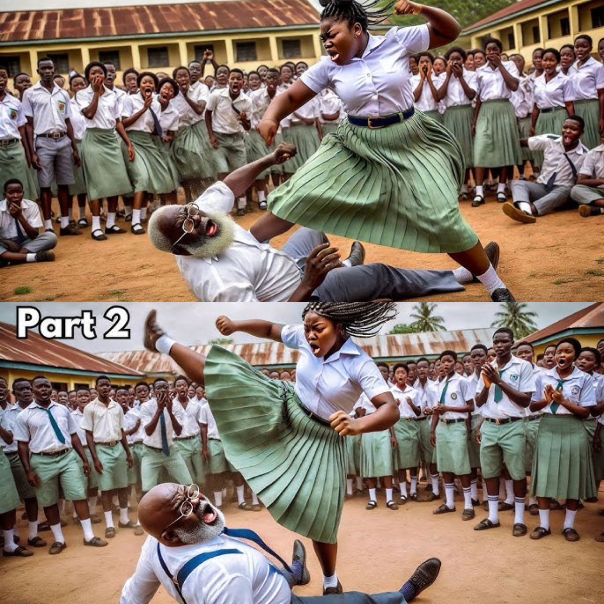 The first to step forward was Mr. Oloye, insisting he could still discipline her. But Amina moved like a whirlwind. A kick, a shove, and Oloye was down again, defeated before his colleagues.