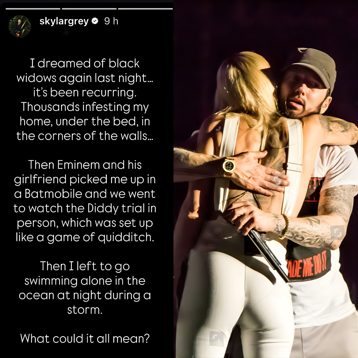 In her post, Grey recounted a vivid, surreal dream in which Eminem and his girlfriend arrived in a Batmobile to pick her up, then whisked her away to witness the Sean Combs trial — reimagined in her subconscious as a full-scale game of Quidditch.