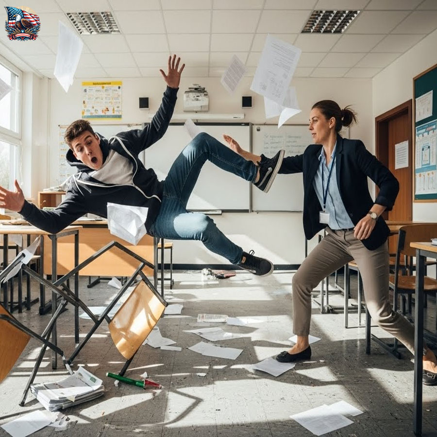 He took in the scene instantly. The star quarterback on the floor. The new teacher standing defiantly behind her desk. The terrified students.