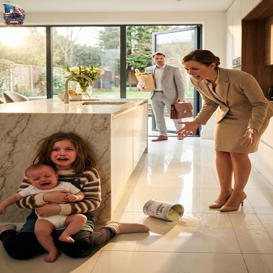 She dropped the bottle. Milk splashed across the marble. Lily flinched, then wrapped herself tighter around her brother.