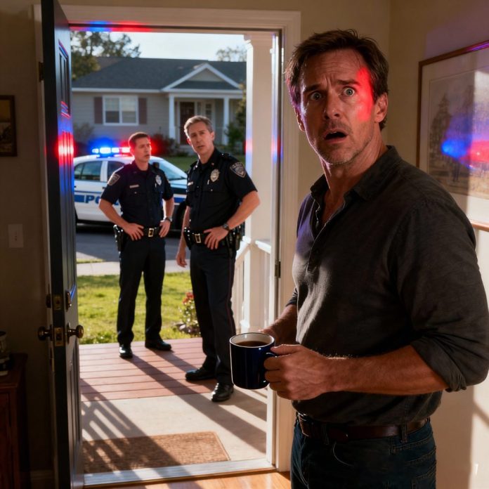Mark Davis was drinking his morning coffee when flashing blue lights painted his living room walls. The knock came softly but firmly. When he opened the door, two uniformed officers stood there—one hand resting on his holster, the other holding a notepad.