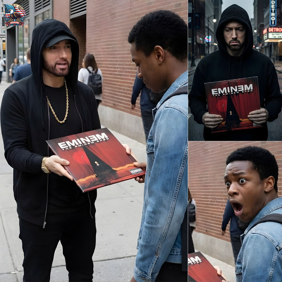 The image was jarring, almost surreal. In an era where chart-topping artists dominate streaming platforms, luxury tours, and billion-dollar brand partnerships, the sight of Eminem standing on a public street, personally selling copies of his own album, sent shockwaves through fans and critics alike. Smartphones were raised, clips spread across social media within minutes, and a single question echoed across timelines worldwide: what is going on?