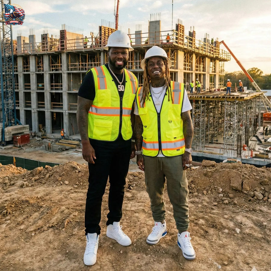 Captured on site, in this imagined scene: 50 Cent and Lil Wayne, standing side by side. No entourage. No performance lights. No cameras rolling for a music video or brand rollout. Just hard hats, blueprints, and a stretch of land about to become something permanent.
