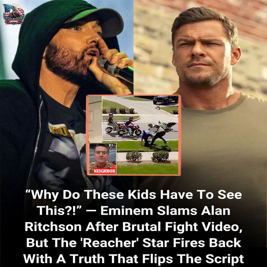 The world of Hollywood and Hip-Hop collided with a “Nuclear” force this morning. When a leaked video showed Alan Ritchson—the 6’3″ powerhouse known as Reacher—unloading a barrage of punches on a neighbor, the internet went into a state of Total Shock. But the loudest voice of condemnation didn’t come from a tabloid; it came from Detroit’s finest, Eminem.